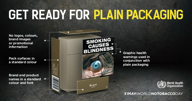 27 May 2016 -- For this year's World No Tobacco Day, WHO and the Secretariat of the WHO Framework Convention on Tobacco Control are calling on countries to get ready for plain (standardized) packaging of tobacco products. Plain packaging refers to “measures to restrict or prohibit the use of logos, colours, brand images or promotional information on packaging other than brand names and product names displayed in a standard colour and font style (plain packaging).