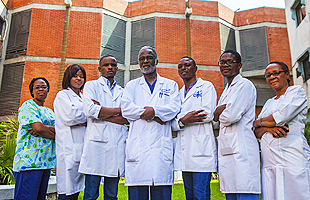 Un groupe d'enfants souriants en uniforme vert et blanc lèvent les mains